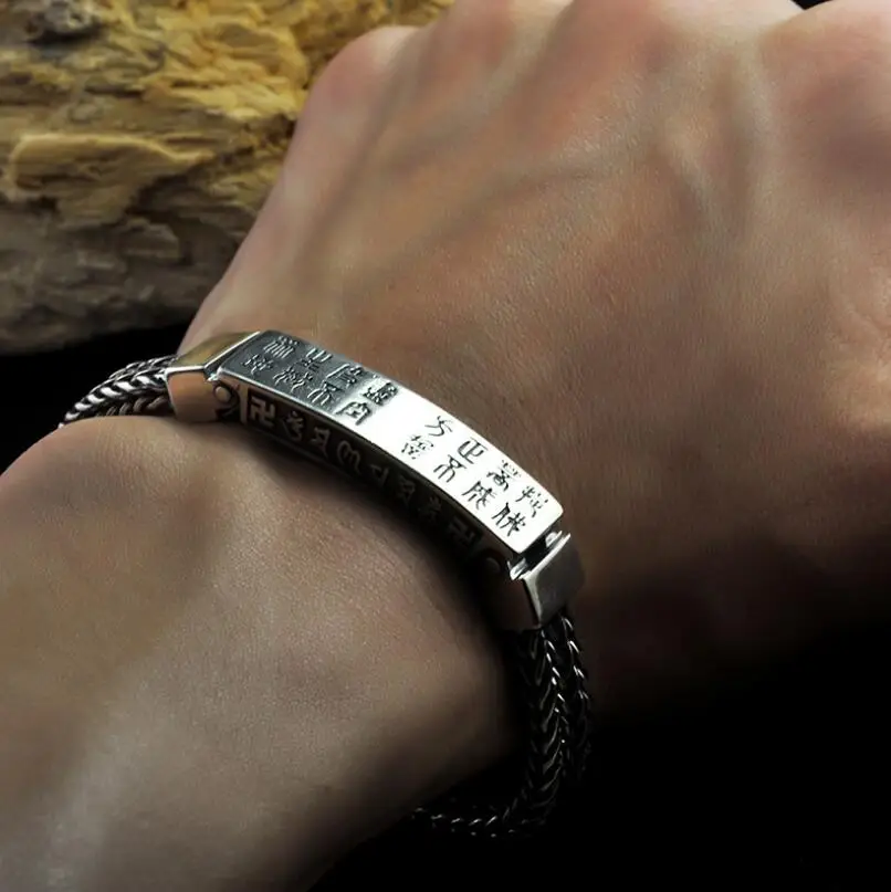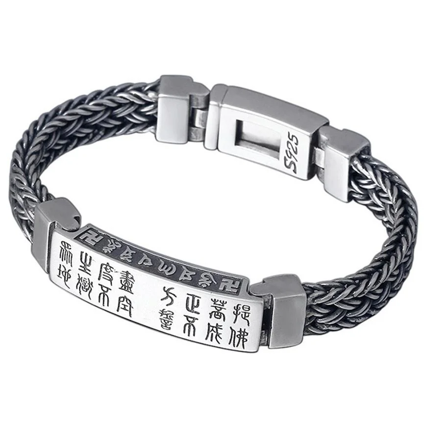 HOT SALE Pure Silver Sterling 925 Silver Carved Buddha Word hand-woven Solid Silver Lock Bangle S925 Bracele