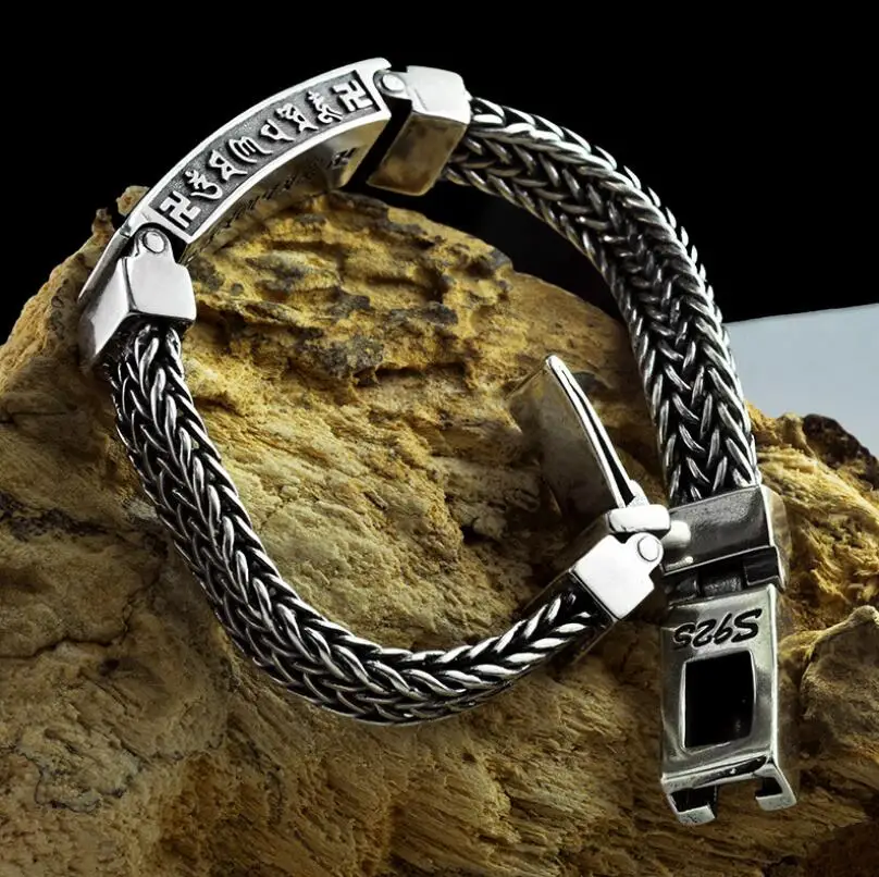Pure Silver Sterling 925 Silver Carved Buddha Word hand-woven Solid Silver Lock Bangle S925 Bracele